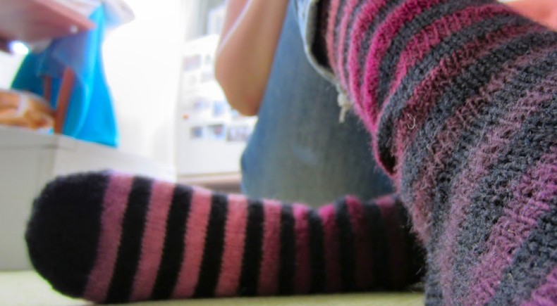 the first sock was perfect from the start. the yarn behaved beautifully and created an almost self-striping pattern. then came the second sock, and all hell broke loose. no matter how many times i started over (and believe me, it was lots) i couldn’t duplicate the color flow. every time i ended up with dark splotches and light splotches. i tried different gauges, starting at different points of the yarn, but no. bob the saint (remember him?) wouldn’t let me off the hook. and no, pooling is NOT something that makes hand-dyed yarn interesting and/or beautiful, it’s fucking annoying, and if anyone tells you otherwise, they’re probably on sedatives or have already died inside a little.